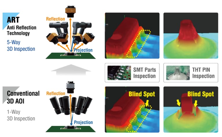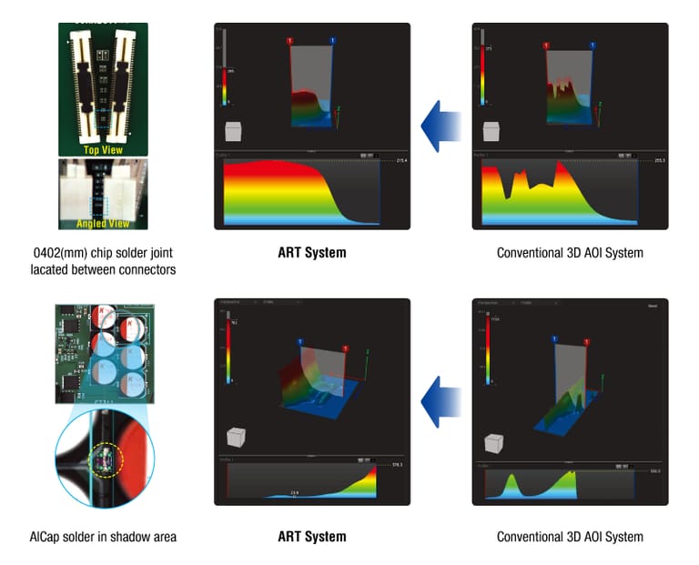 Due to its multiple camera angles, ART can inspect solder joint within shadow areas more easily than conventional 3D AOI systems.
